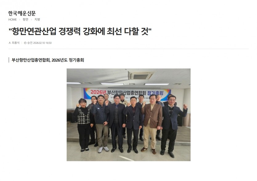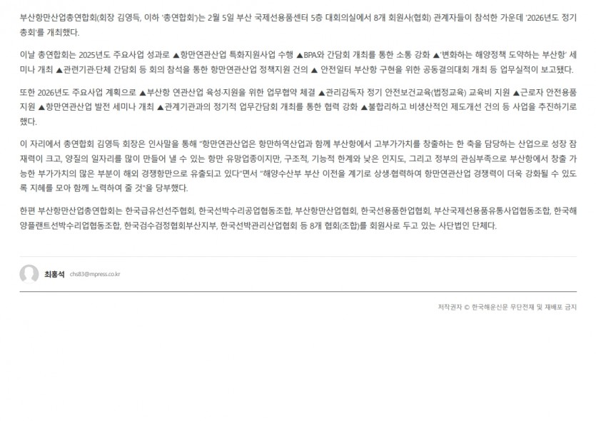 부산항만산업총연합회 [한국해운신문] 기사내용 페이지 정보 작성자 최고관리자 댓글 0건 조회 42회 작성일 26-02-11 10:01 본문 부산항만산업총연합회 [한국해운신문] 기사내용 2026년 2월 10일 목록 이전글부산항만산업총연합회 [해운산업신문] 기사내용 26.02.11 다음글부산항만산업총연합회 부산일보 기사내용 26.01.29 댓글목록 댓글목록 등록된 댓글이 없습니다.